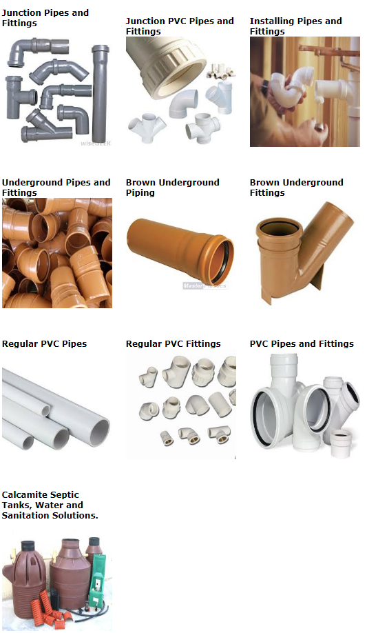 3- 40/50MM PVC PIPES AND FITTINGS- these are the smaller sized pipes and fittings and are used to take the water from the smaller sanitary items such as basins, baths, showers and sinks to the main drain. They are white in color and can be laid in or above ground and also in concrete slabs and floors.
