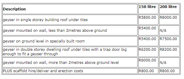 Geysers come in various sizes. The more common are 50/100/150 and 200 litres with the majority being 150litre.on this page there are pictures of the various geysers and the spares all from our associated partners. Look up our price lists and phone holleys plumbing to get the job done.